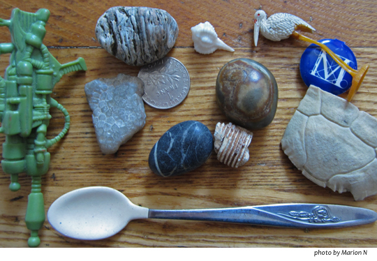 The picture above shows the objects I always take with me when I travel, all in a little bag. The plastic gun is left over from one of my children’s long-vanished action figures. The little spoon is what I used to give my kids their first solid food. The bag also holds a French one-franc coin, a tiny shell from the Florida Keys, a fossil crinoid stem from Missouri, a lapel button from the Metropolitan Museum, a piece of turtle shell found in the woods in Missouri, stones from Nova Scotia and from three Great Lakes – Ontario, Superior and Michigan (yes, that is a Petoskey stone). I have no idea where that plastic stork came from, but it’s been in my life so long that it probably was not made in China.