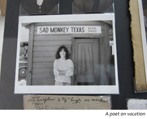During our visit, we also spent quite a bit of time looking at the current exhibition “Poet Photos: from the Archives of Poetry Magazine” – snapshots submitted to Poetry over the years by its contributors. The images are mischievously sorted by type – for instance, the poet on vacation, the poet with an animal (rather often, a reluctant cat), and an entire case of poets gazing off into the distance – and are pleasingly unlabeled. I didn’t recognize most of these faces (like me, you will probably be able to identify Allen Ginsberg and also will be able to say, “Hey, there’s an Airedale”), and I found the mystery made this an ever more fascinating window.